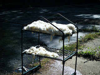 This used to be a green house but works nicely as a drying station. After it was done dripping, I brought it into the porch and ran a fan at it. It was nearly dry the next morning. The wool is East Fresian/Poly cross.